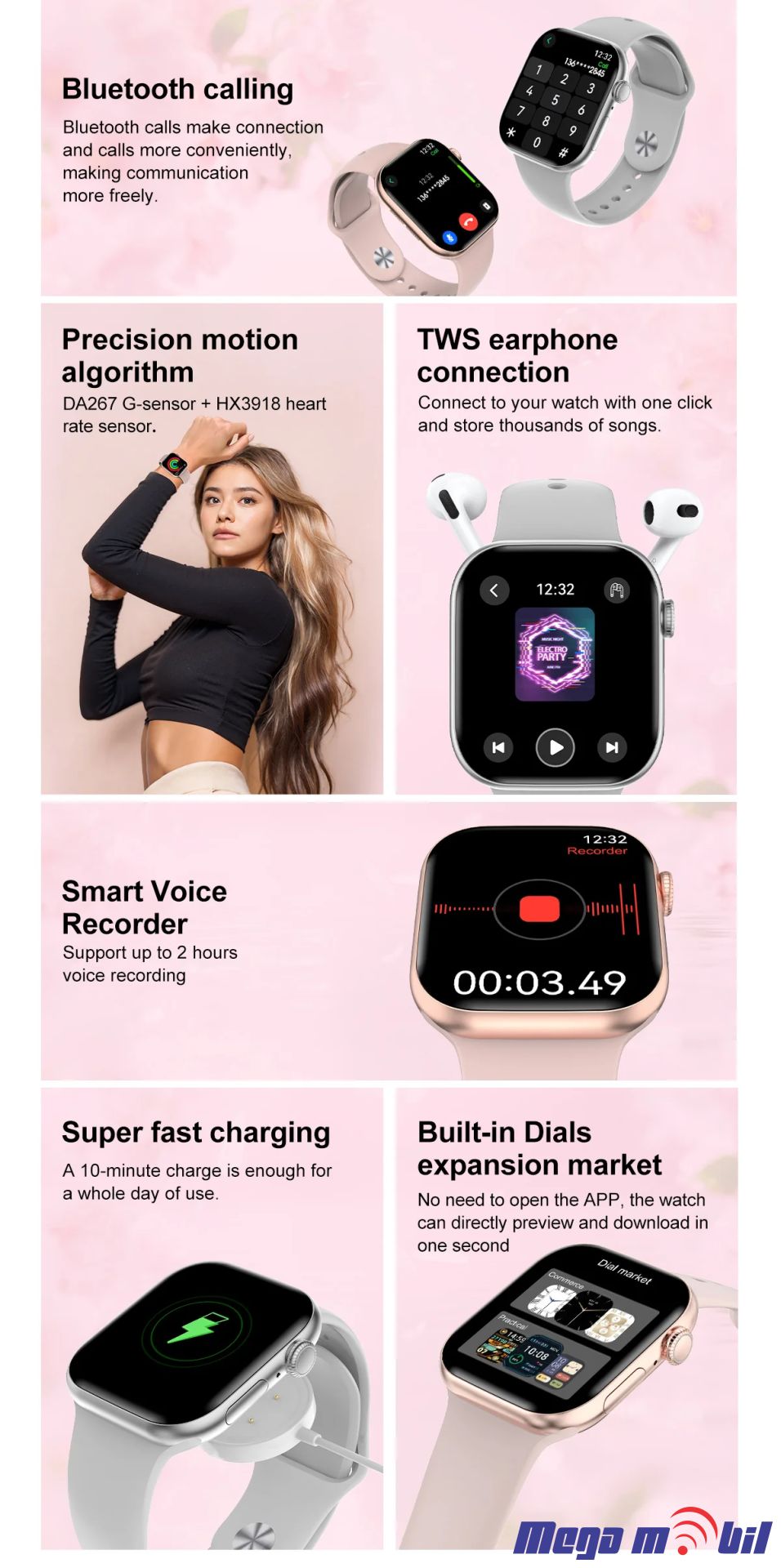 Bluetooth calls, 9 menu styles, multi-sports mode, heart rate, blood oxygen, sleep, weather, Bluetooth music playback, local music playback, breathing training, voice assistant, exercise records, contacts, call records, information push, calculator, recorder, games, alarm clock, stopwatch, timer, flashlight, find mobile phone, remote photo taking (connect to mobile phone), album, video, quick components, brightness adjustment, power saving mode, multiple standby dials, menu wallpaper settings, password protection