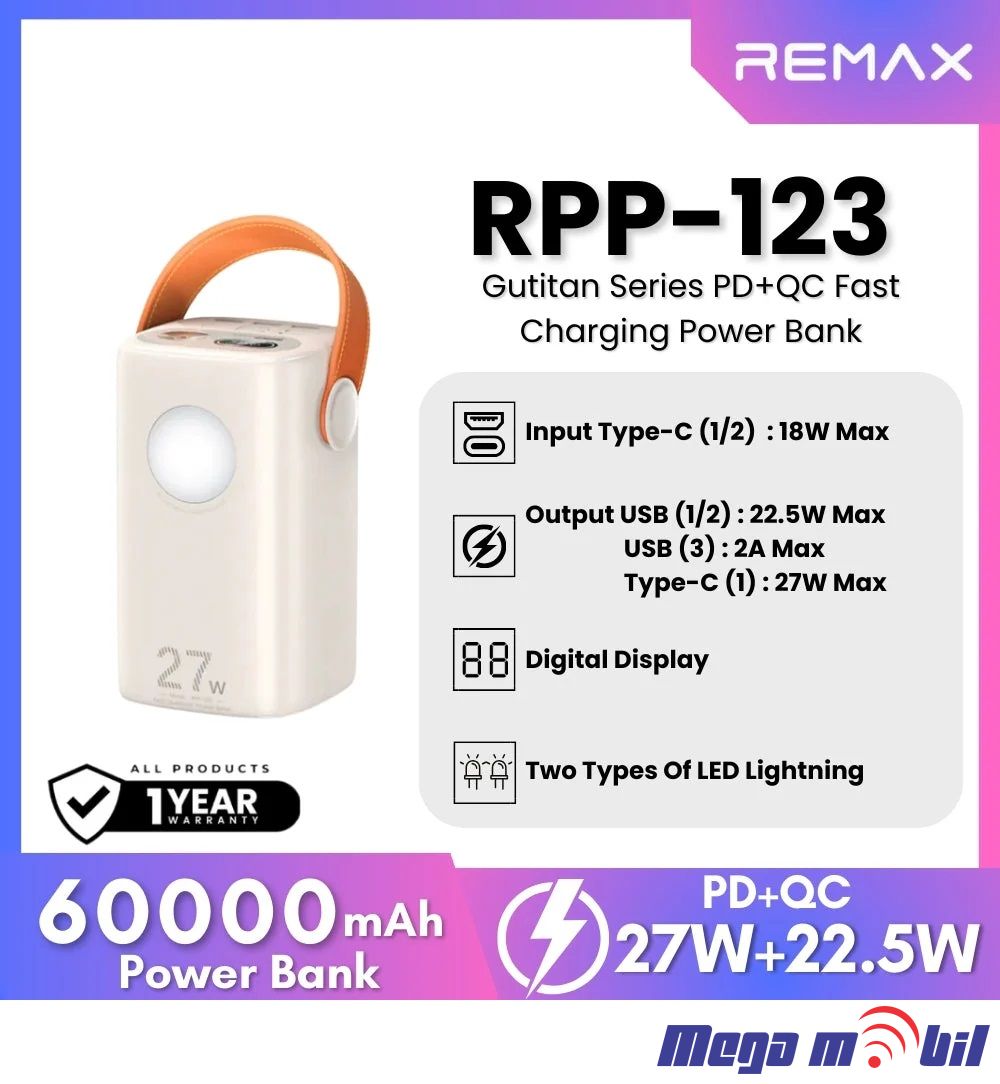 Baterija eksterna 60000mAh REMAX Gutitan RPP-123 PD 27W+QC 22.5W beige